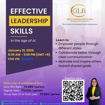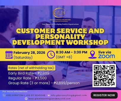 Enroll in any of our public seminars this 2025 to be trained or to train your team. Details on how to enroll is shown by clicking on the images below. We gladly welcome you to our upcoming seminars! For consulting or training services, you may reach us at (02) 83567294 / (0917) 8678007 / info.glbconsulting@gmail.com